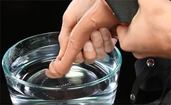 Als Janneke weer terug is, geeft ze Joris het glas. Hij doopt de top van de penis in het water en zuigt de vloeistof op door in de lul te knijpen. “Let nu goed op”, zegt hij. “Ik ga hem laten spuiten.” Janneke wacht gespannen af. Dan opeens… Knijpt Joris heel hard in de lul. Een enorme straal spuit krachtig recht in het gezicht van Janneke.