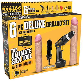 “De Drilldo 6-Piece Deluxe Set bestaat uit een oplaadbare boormachine en 2 dildo’s die met de universele Vac-U-Lock plug in de boorkop vastgedraaid kunnen worden. De huidkleurige dildo’s zijn realistisch vormgegeven en zijn gemaakt van buigzaam PVC. De dildo’s hebben een ronde, gladde eikel en zijn rondom de schacht voorzien van duidelijk voelbare aderen. De kleinste dildo is 25,4 cm. lang, de grootste is 30,48 cm.