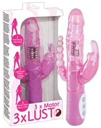 De drie dubbele rabbit vibrator zorgt dus met zijn slanke anaal stimulator voor een optimale lust ervaring, of zoals de producent in grote letters op de verpakking schrijft: “3 x MOTOR – 3 x LUST”. In elk onderdeel van deze roze rabbit zit een eigen motor die zorgt voor rotatie en drie vibratie niveaus. Alle functies zijn apart in te stellen en eenvoudig te besturen. De vibrator heeft een totale lengte van 22 cm met een penetratie diepte van 11 cm. Diameter van 1 tot 3 cm.